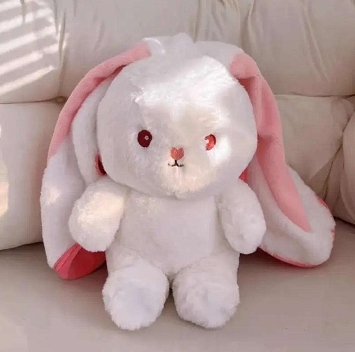 • Designed in a Japanese kawaii plushie style, featuring oversized sparkling eyes, soft pink blush on the cheeks, a tiny embroidered nose, and little floppy ears that radiate sweetness.